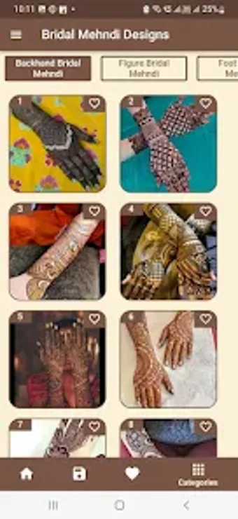 브라이덜 메헨디 디자인 2023의 특징 중 하나는 다양한 카테고리의 폭넓은 범위입니다. 아랍식 브라이덜 메헨디 디자인부터 도형 브라이덜 메헨디 디자인, 발 브라이덜 메헨디 디자인 등 다양한 디자인이 있어 모두에게 맞는 디자인이 있습니다. 앱에는 레헨가 디자인과 네일 아트와 같은 관련 카테고리도 포함되어 있어 사용자가 특별한 날을 위해 일관된 완벽한 룩을 만들 수 있습니다.